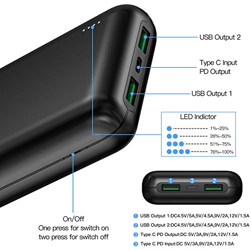 - ❤ 【7 Horas para Cargar el Power Bank】Gracias a la tecnología PD, el bateria externa quick charge 3.0 se puede cargar completamente en aproximadamente 7 horas con un cargador PD o un cargador rápido USB-C y es el doble que un bateria portatil de 5V/2,4A.