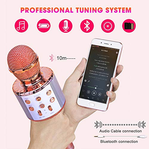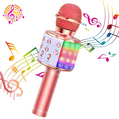 ShinePick Micrófono Karaoke Bluetooth, 4 en1 Microfono Inalámbrico Karaoke Portátil con Luces LED para Niños Canta Partido Musica, Compatible con Android/iOS PC, AUX o Teléfono Inteligente (Oro rosa)