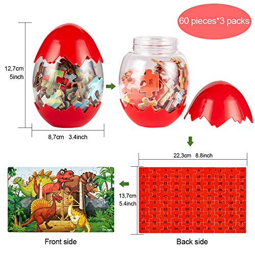 - Huevo de dinosaurio para almacenamiento -- cada diseño de rompecabezas contiene 60 piezas individualmente, más un lindo huevo de dinosaurio como contenedor. El huevo es divertido y fácil de llevar. Perfecto para que los niños formen un hábito de almacenamiento y para que los niños lleven el juguete a la escuela, las vacaciones, la casa de los abuelos.
