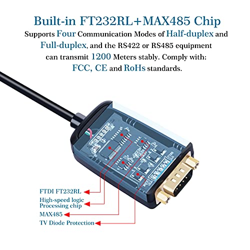 - El convertidor USB a RS422 o RS485 tiene un chipset FT232 integrado de alto rendimiento FTDI, lo que le permite conectar rápidamente dispositivos RS422 o RS485 al puerto USB de su computadora portátil.