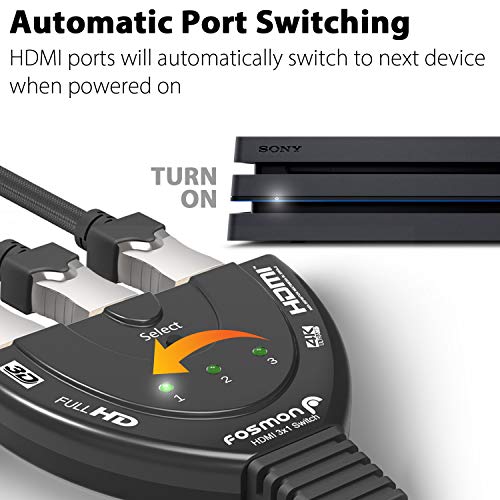 - CONECTE A 3 DISPOSITIVOS HDMI: El conmutador HDMI 3x1 de Fosmon le permite conectar hasta 3 dispositivos de entrada HDMI diferentes a su televisor, monitor o proyector