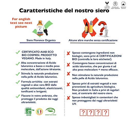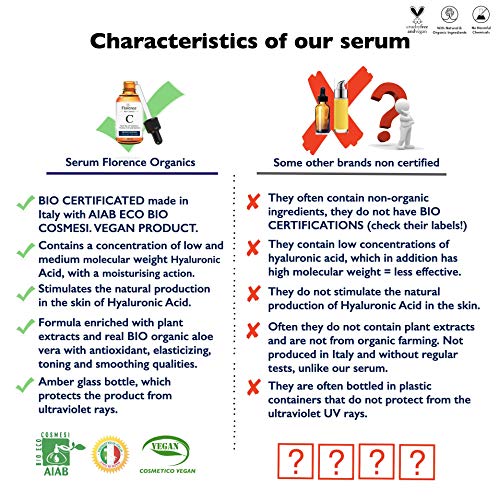 - GARANTÍA DEL PRODUCTOR: Gracias a la calidad de nuestras materias primas procedentes de la agricultura ecológica, todos nuestros productos han obtenido la certificación orgánica AIAB Eco COSMÉTICO, SKINCARE HECHOS EN ITALIA. Si no ama nuestro suero con ácido hialurónico en un plazo de 30 días después de la compra, Florence le hará un reembolso completo sin complicaciones. Compre hoy con toda tranquilidad y cuide su piel con la cualidad de nuestro suero anti-edad para el tratamiento facial.