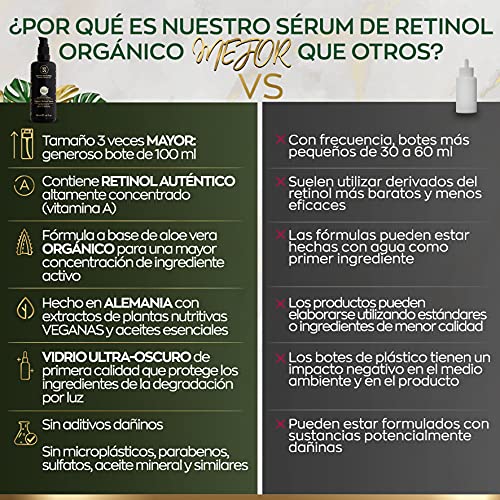 - ESTUDIOS A NIVEL MUNDIAL PRUEBAN SU EFICACIA CIENTÍFICAMENTE: los estudios científicos demuestran que el auténtico retinol es la fuente de vitamina A más activa - un remedio anti-envejecimiento muy eficaz. Incorporamos los hallazgos de todos los estudios disponibles en el desarrollo de producto. Cosmetic Analysis confirma la seguridad de nuestras materias primas al otorgarnos la calificación de muy bueno.