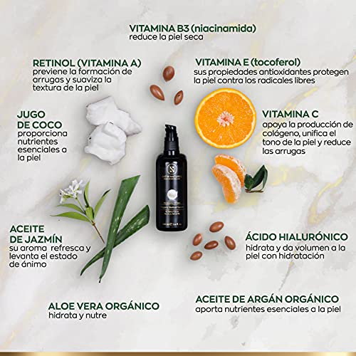 - BENEFICIOS PARA TU BELLEZA: el retinol combina aloe vera orgánico, vitamina C, ácido hialurónico, coco y aceite de argán en esta exclusiva combinación para el cuidado de la piel. Esse serum facial antiarrugas protege la piel contra los radicales libres; reduce las manchas de pigmentación; estimula la renovación celular en la capa superior de la piel y la producción de colágeno en las capas inferiores; reduce la destrucción de colágeno relacionada con la edad.