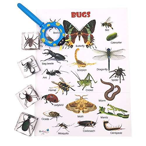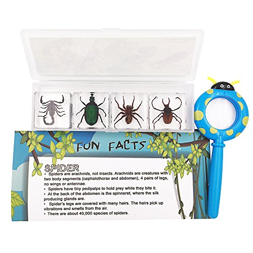 WhizKidsLab 4PZAS Juego Insectos Reales Resina Arácnido Espécimen Stem Set Bichos Lupa Póster Datos Curiosos