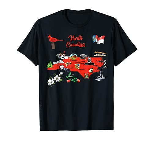 - La camiseta con diseño de mapa de Carolina del Norte con símbolos del estado es el regalo perfecto para hermano o hermana, cumpleaños, Navidad o vacaciones. Camiseta de mapa de dibujos animados de Carolina del Norte para hombres, mapa de atracciones de Carolina del Norte para mujeres y niños