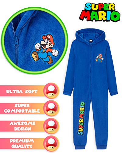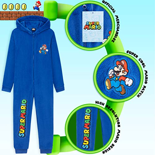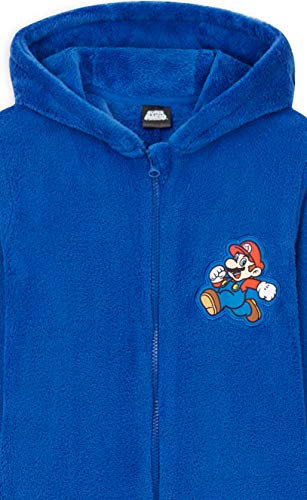 Super Mario Pijama Niño de Una Pieza, Pijama Entero con Mario Bros, Pijamas Niños de Forro Polar con Capucha, Regalos para Niños y Adolescentes 4-15 Años (Azul, 9-10 Años)