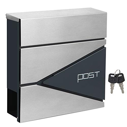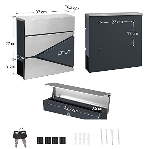 SONGMICS Buzón de Correo, Buzón de Correo Montado en la Pared con Cerradura con Soporte para Periódicos, Acero Inoxidable, Fácil de Instalar, Gris Antracita y Plata GMB51AS