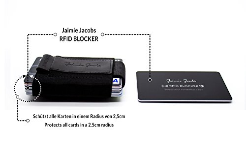 - PROTECCIÓN RFID: La sencilla tarjeta de protección de Jaimie Jacobs protege todas las tarjetas con chips RFID y NFC de lecturas externas por parte de apps móviles, terminales, etc.