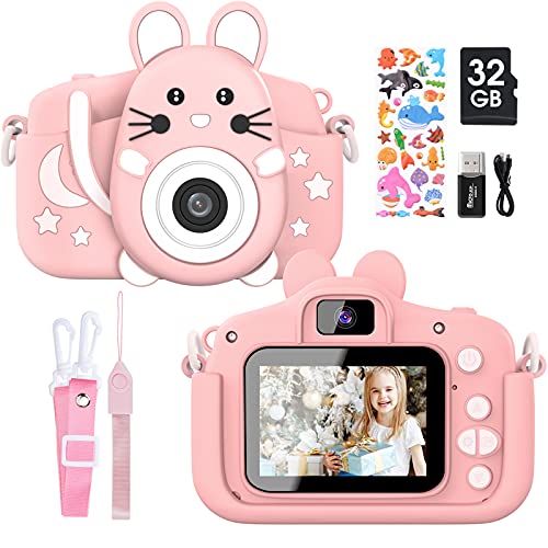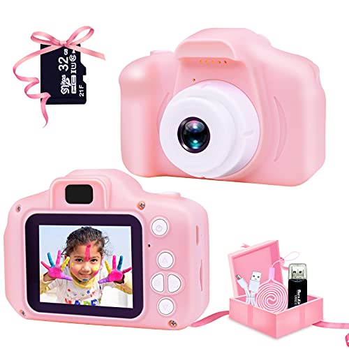 Faburo Set de Cámara de Fotos Digital para Niños, Cámara Infantil con Tarjeta de Memoria Micro SD 32GB, Cámara Digital Video cámara Infantil para Niños Niñas Regalos de cumpleaños, 1080P, Rosa