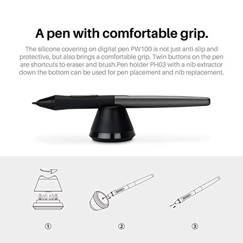 - Lápiz sin batería: no es necesario cargarlo ni más baterías. Con tecnología EMR avanzada, H1060P permite crear durante mucho tiempo sin interrupciones no deseadas. Admite reconocimiento de inclinación de ± 60 grados, lo que le permite dibujar líneas más naturales con diferentes ángulos, lo que hace que su obra de arte sea más sofisticada. Una velocidad de informe rápida de 233 PPS garantiza una grabación fluida sin demora.