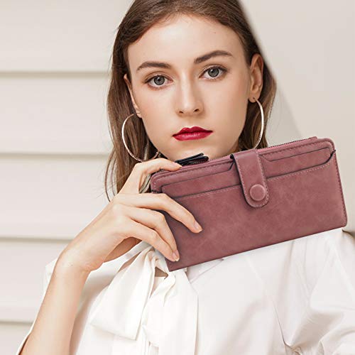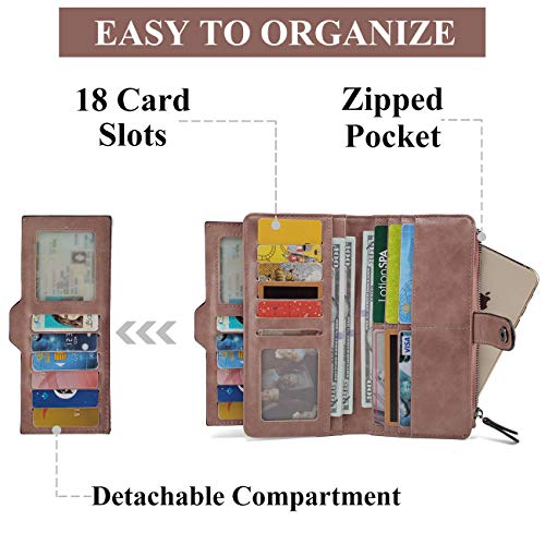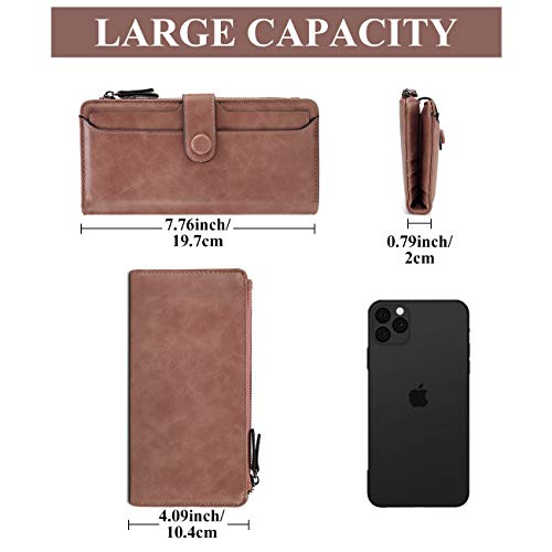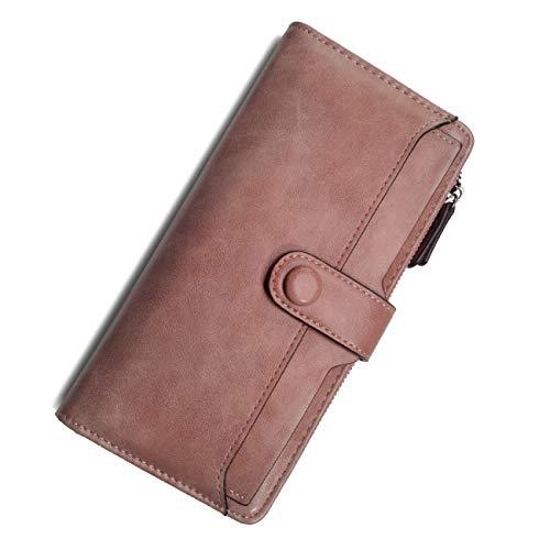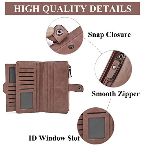 VASCHY Billetera Mujer,Carteras de Mujer Piel Monedero Mujer Grande Bolso Movil de Piel para Dama con Múltiple Ranuras Tarjetas y Bolsillo con Cremallera Marrón (Rosa Loto-Desmontable)