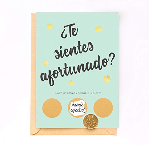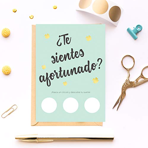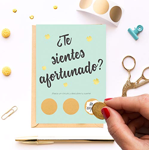 - Está impresa en tinta dorada con relieve, en ambos lados, y tiene un rectángulo en blanco para que puedas escribir el mensaje, regalo o sorpresa que tú quieras. Después pega encima el adhesivo rasca, y ya solo te quedará entregársela para que rasque con una moneda (mejor sobre una superficie dura) y alucine con la sorpresa/regalo/mensaje!