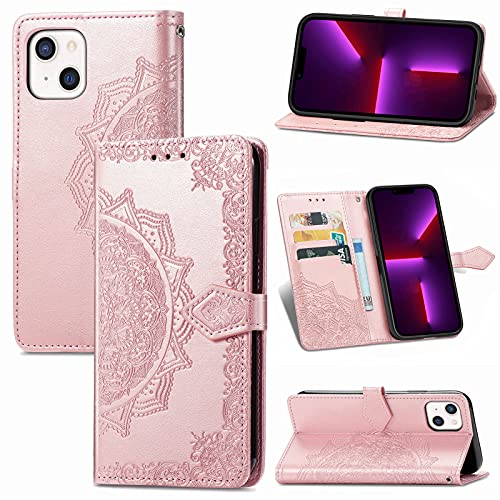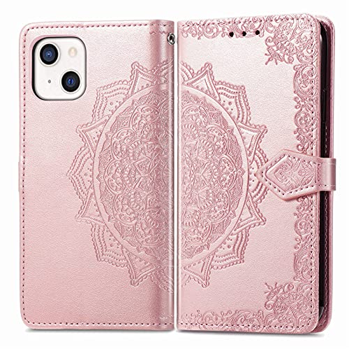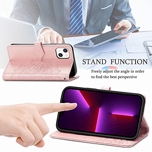 Fertuo Funda para iPhone 13 Mini, Carcasa Libro con Tapa de Cuero Piel con Ranuras de Tarjeta, Soporte, Cierre Magnético [Mandala] Wallet Case Flip Cover para Apple iPhone 13 Mini, Oro Rosa