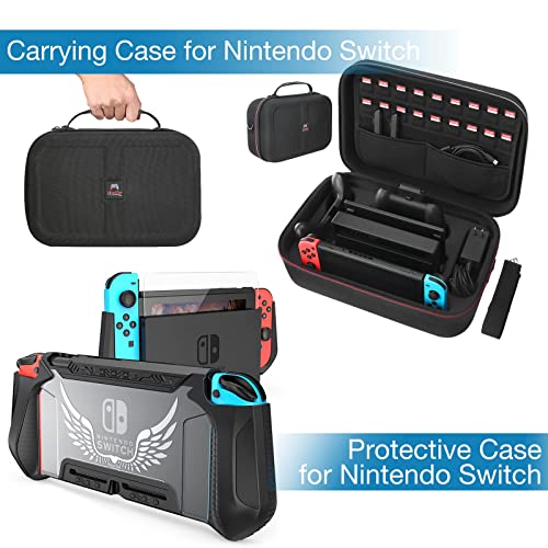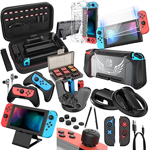 HEYSTOP Accesorios para Nintendo Switch con Funda para Nintendo Switch, Carcasa Switch, Protector Pantalla, Volantes y Grip, Soporte Juegos, Base de Carga, Estuche J-con, Thumb Grips, Cable USB etc.