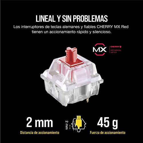 - Interruptores Cherry MX Red de fabricación alemana: suaves y rápidos se caracterizan por una conmutación lineal sin clic audible; si eres jugador de acción o escribes rápido, la característica de conmutación lineal combinada con una baja resistencia del resorte permite una respuesta rápida y un disparo suave