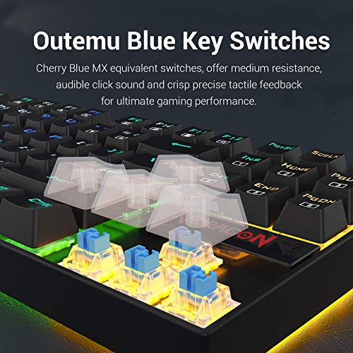 - LED RGB BACKLIT ANTI GHOSTING TECLADO; TODAS las teclas de los teclados mecánicos para juegos 87 están libres de conflictos (n-Key Rollover) para un rendimiento de juego superior. Con 12 teclas multimedia, diseño antideslizante ergonómico, a prueba de salpicaduras, patas traseras ajustables para el ángulo de tipeo perfecto, cable USB de alta velocidad con conector USB libre de corrosión dorado para una conexión confiable que resistirá los juegos hardcore rápidos.