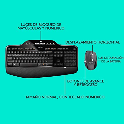 - Duración de Pilas Prolongada: Duración media de las pilas de 24 meses para el teclado y 12 meses para el ratón