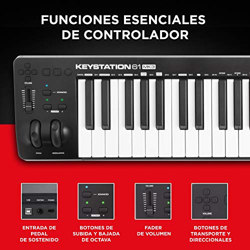 - Control total - Fader de volumen, botones de transporte y direccionales para facilitar el control de su software, además de ruedas de modulación y afinación diseñadas ergonómicamente, botones de subida y bajada de octava y entrada de pedal de sustain