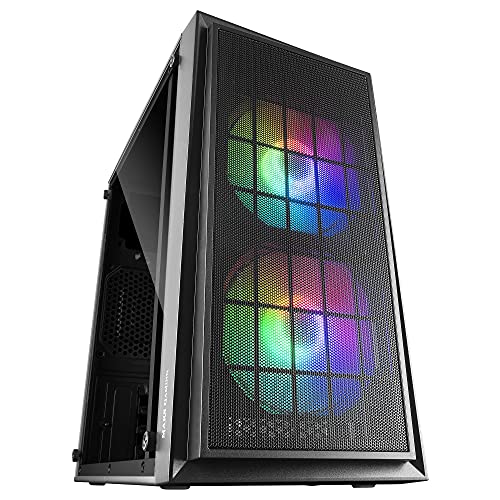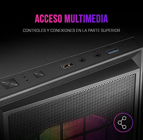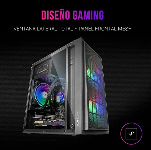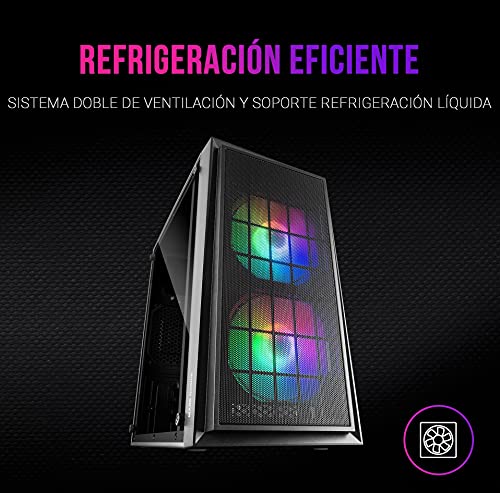 - DISEÑO GAMING: da el salto al PC de tus sueños gracias a la caja Gaming MCDUO, incorpora ventana lateral total, 2 ventiladores frontales FRGB de 12 cm tras una rejilla metálica y los controles y conexiones en la parte superior, hacen que esta caja de ordenador se convierta en la pieza central de tu setup