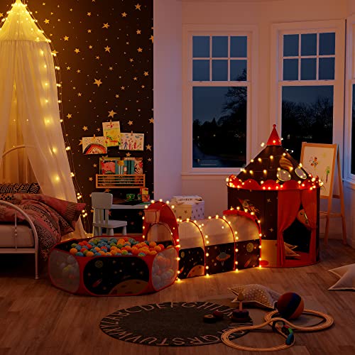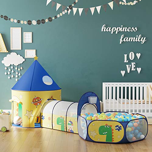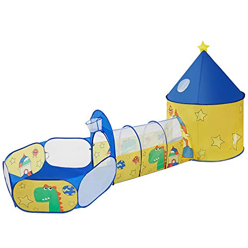 SONGMICS 3 en 1 Tienda campaña Infantil, Casita túnel Infantil Pop-up, con Piscina de Bolas, Tema de Dinosaurio y Espacio, Idea de Regalo, Fiesta de cumpleaños, Amarillo y Azul, Navidad, LPT702Y01