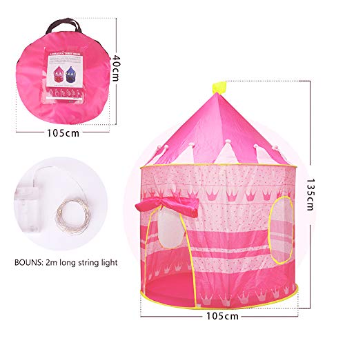 - ♥ Súper portátil - esta tienda de princesa rosa puede doblarse sin esfuerzo en un tamaño pequeño para facilitar su almacenamiento y transporte. Cuando se pliega, tiene solo 40 cm de diámetro y se ajusta a la bolsa de transporte con cremallera, para que pueda llevar el castillo de sus hijos a donde quiera.