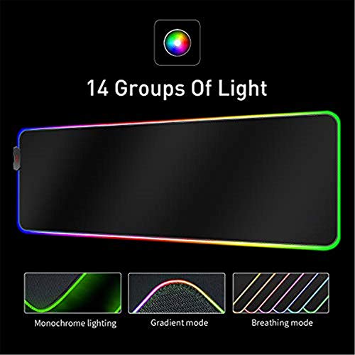 - 【14 Modos de iluminación de croma RGB】 Almohadilla de mouse que incluye 7 modos dinámicos: gradiente asíncrono, gradiente síncrono, degradado síncrono, parpadeo asíncrono, gradiente de parpadeo asíncrono, luces apagadas, respiración síncrona, respiración asíncrona. 7 Modos de iluminación estática: Rojo, Verde, Azul, Púrpura, Cian, Amarillo, Blanco. Obtenga una impresionante visualización de colores y efectos.