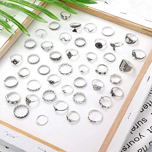 - → PAQUETE DE ANILLOS --- Anillos vintage de 44 piezas en estilos creativos y diferentes, diseño de tallado vintage, plateado, esos anillos apilables pueden darle un aspecto encantador y ganar más cumplidos