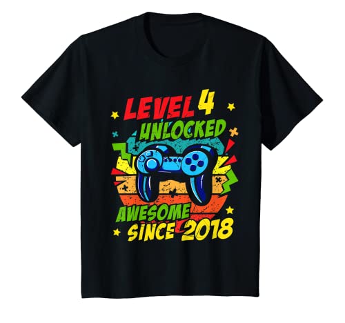 - El nivel 4 desbloqueado impresionante desde 2018 es un regalo de videojuego de 4 cumpleaños para niños, niñas, niños que son fanáticos de los videojuegos finalmente cumplen 4 años. Con un controlador de videojuegos y un fondo retro vintage.