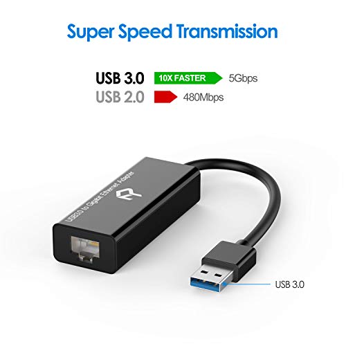 Rankie Adaptador de Red, USB 3,0 a RJ45 10/100/1000Mbps Gigabit Ethernet, Negro