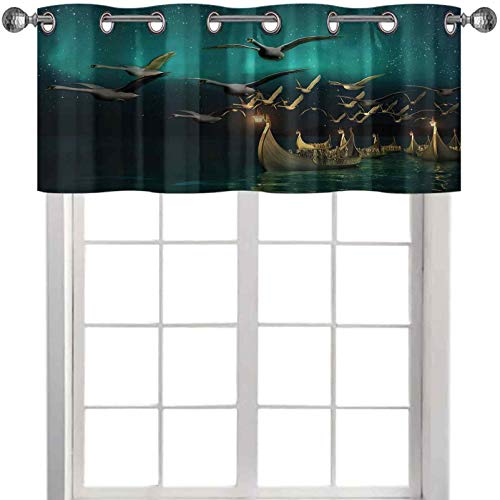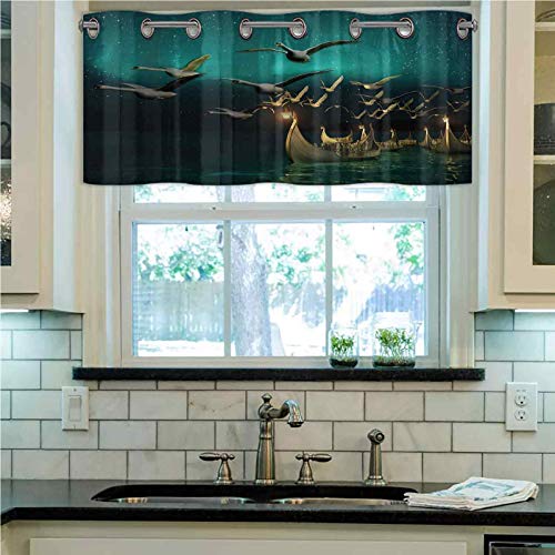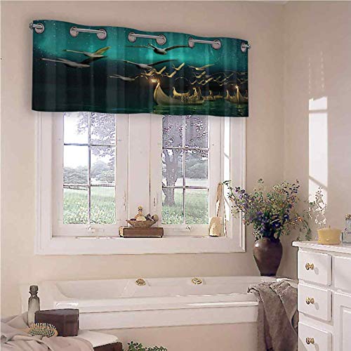 Cenefa de ventana de cocina medieval Elf Boats and Magical Birds Swans Flying Mystical Adventure Ilustración 50 pulgadas de ancho x 18 pulgadas de largo cortinas valencia para ventanas Teal Gold