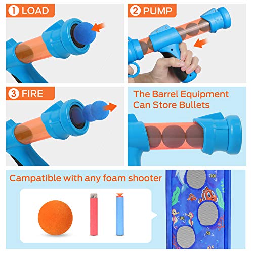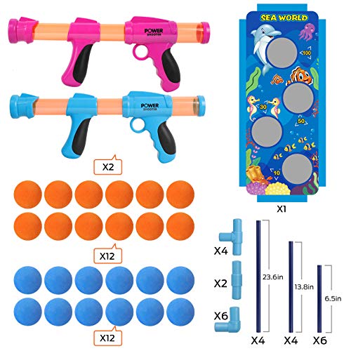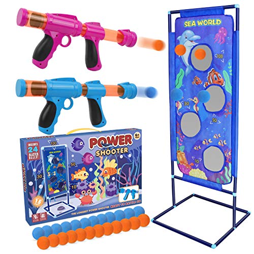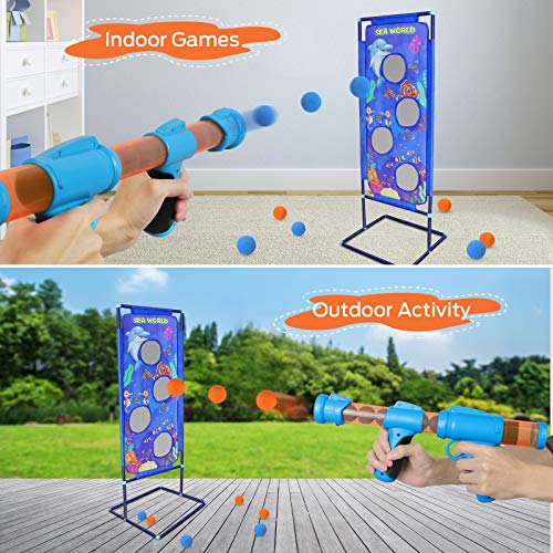 - ?【Juego de Disparos para 2 Jugadores】Estas pistolas de aire comprimido vienen con 2 paquetes de pistolas de juguete, 24 bolas de espuma blanda, 1 blanco de tiro de pie con temática marina. Gran juguete de interior y exterior para niños y niñas de 5, 6, 7, 8 y 9 años o más. Puede jugar con su pareja en el interior, sala de estar, al aire libre, césped y otros lugares