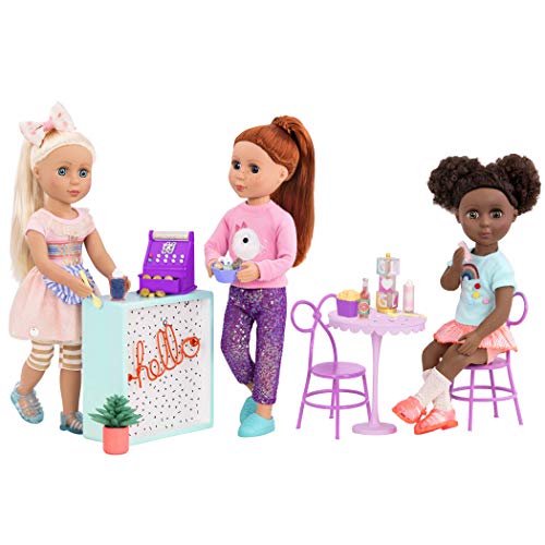 - GG Sweet Shop Terrace Set Incluye: 1 contador, 1 torre de cubos giratorios, 1 mesa, 2 sillas, 1 registro de efectivo, 1 platillo, 2 platos, 2 cuencos, 1 cristal de paja, 6 monedas, 4 cucharas, 1 planta, 2 cajas de palomitas, 2 sodas, 2 botellas de leche de chocolate, 2 vasos de gelatina, 2 vasos de crema batidos, 6 meringues, 8 pretzels, 6 cintas y 8 mosquitas. Las muñecas y vestidos se venden por separado.