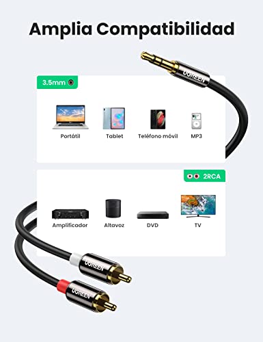 - COMPATIBILIDAD AMPLIA: UGREEN cable rca a jack 3.5 mm ofrece una solución eficaz y económica para conectar un dispositivo de audio que tenga conector 3,5mm a un dispositivo de reproducción que admite entrada de 2 RCA. El conector 3,5mm admite: PC, Smart TV, tablets(iPad), reproductores MP3(iPod), móviles(iPhone, Galaxy), ect. 2 RCA conectores: el rojo para el audio derecho y el blanco para el izquierdo, admite amplificador, altavoces,DVD, u otros sistemas de sonido con conexiones 2RCA.