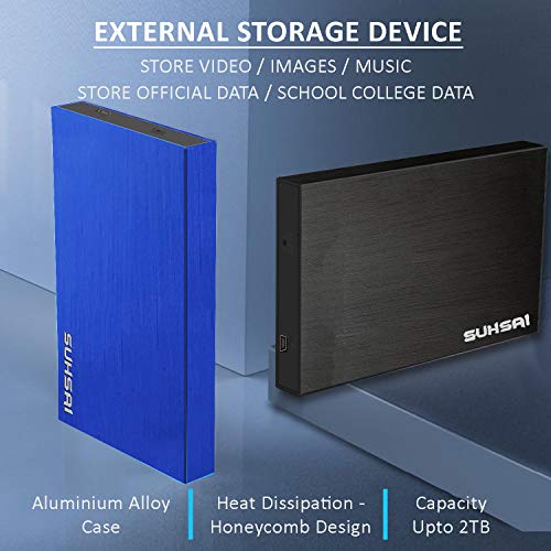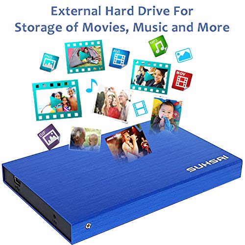 - Disco duro externo: con el disco duro portátil Suhsai disfruta de películas, música e imágenes sobre la marcha. Disco duro externo 2.0 USB con diseño delgado tiene múltiples opciones de tamaño de 100 GB a 1 TB que te dará todo lo que necesitas para almacenar tus datos y multimedia.