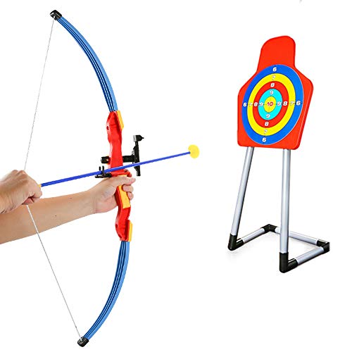- CARACTERÍSTICAS: Arco curvo con puntero laser incorporado para aumentar la precisión de puntería. Incluye flechas con ventosa y un tablero de objetivo con soporte de pié.