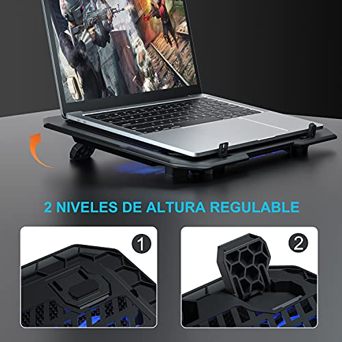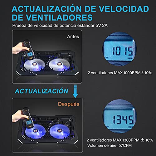 - 【Actualización de velocidad】 2 ventiladores han actualizado el motor con una velocidad de 1300 RPM, la refrigerador portátil puede traer más volumen de aire y evitar que la computadora portátil se sobrecaliente.