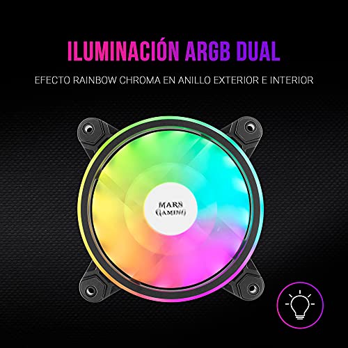 - Iluminación argb dual impresionante iluminación dual argb tanto en anillo exterior e interior; compatible con todo tipo de controladores y placas base argb; y en el caso de que no dispongas de ningún controlador argb, no hay problema, sólo con conectar el mfx obtendrás el más espectacular efecto de iluminación rainbow chroma automático