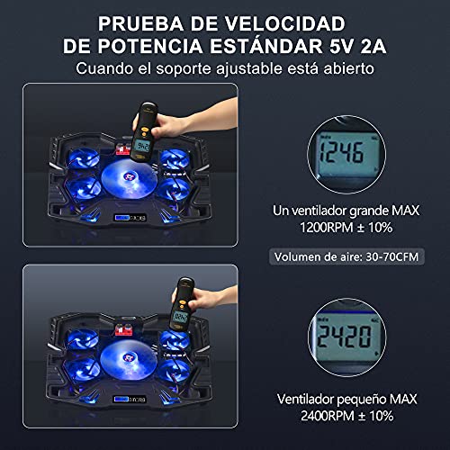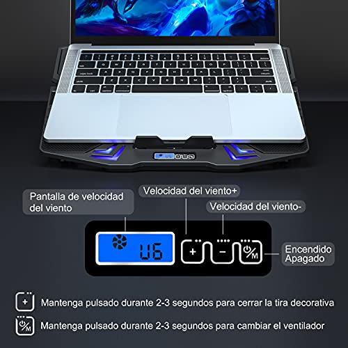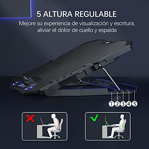 TopMate C5 10-15.6 Pulgadas Gaming Laptop Cooler Cooling Pad, 5 Ventiladores silenciosos y Pantalla LCD, 5 ajustes de Altura, 2 Puertos USB y luz LED Azul