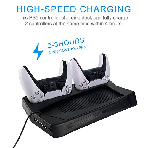 - ✔ Soporte vertical multifuncional: consola de tienda con soporte todo en uno, ya sea en disco o edición digital, 2 controladores para PlayStation 5, soporte de almacenamiento + ventilador de refrigeración para consola + base de carga para controladores PS5 con 2 indicadores LED + 3 puertos USB HUB para cargar y transferencia de fecha