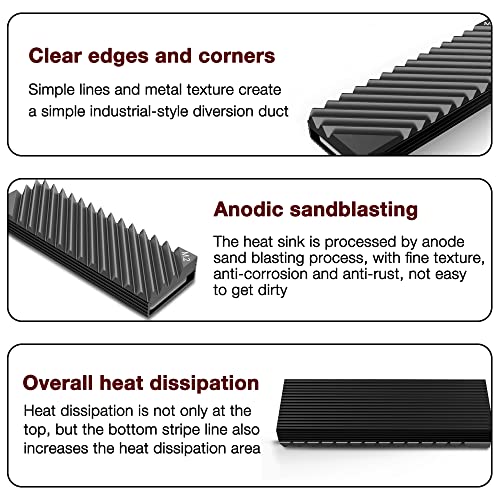 - El refrigerador M.2 adopta todos los tratamientos de chorro de arena de aluminio y anodos, la aleación de aluminio es antioxidante, mejora considerablemente la resistencia a la corrosión, la dureza, la resistencia al desgaste, el aislamiento y la resistencia al calor del disipador de calor M.2 SSD. Esto permite prolongar la vida útil del radiador.