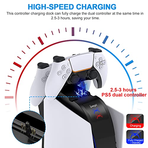 - ✔ Estación de carga rápida para controladores PS5: para carga de alta velocidad, el adaptador de corriente de 5 V con corriente superior a 1,5 A se utilizará como fuente de alimentación, 2-3 horas para cargar completamente dos controladores PS5, con indicador LED, luz roja significa carga, azul luz significa que la carga está completa