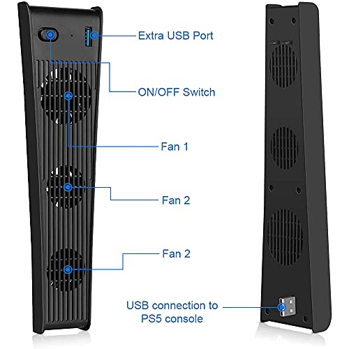 - Velocidades de alta eficiencia de hasta 4000 RPM para extraer el calor de la consola PS5 y mantener su temperatura de trabajo, manteniéndola fresca durante las intensas partidas multijugador en línea. Fácil de usar: No necesita herramientas ni abrir su PS5. Introduzca el USB macho en la abertura USB de la consola. Se encenderá un LED azul y los 3 ventiladores de refrigeración comenzarán a enfriar su PS5. Basta con que conecte su PS5 y encienda el interruptor del ventilador de refrigeración.