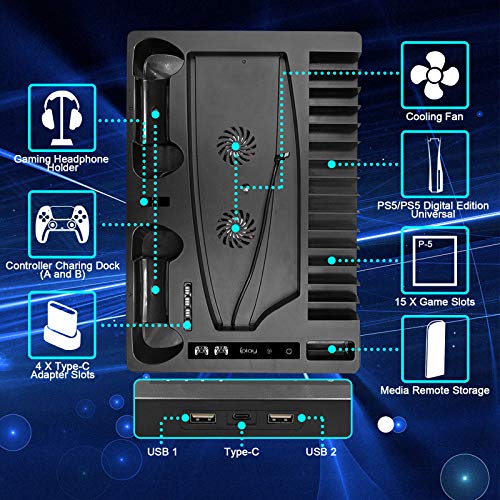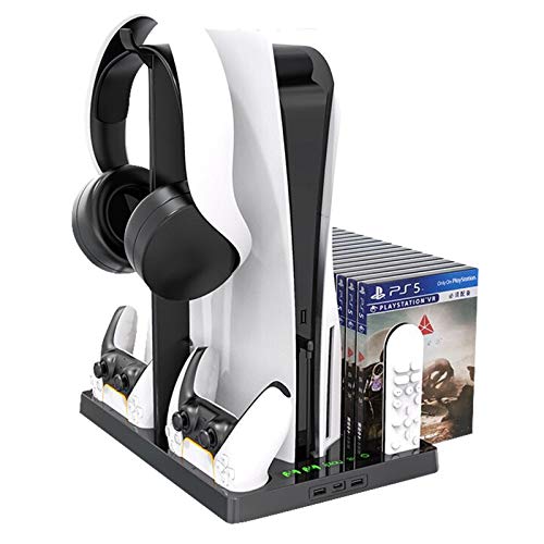 - 【Accesorios de soporte vertical multifuncional para PS5】: Soporte todo en uno para PlayStation 5, que puede realizar múltiples funciones. Ventilador de refrigeración de la consola PS5; Hay 15 ranuras para tarjetas en el lateral del soporte para almacenar discos de juego de 15 piezas; 2 estaciones de carga para controlador PS5; El medio de almacenamiento puede poner auriculares; con 2 indicadores LED + 2 puertos de salida USB A + 1 puerto de salida tipo C.