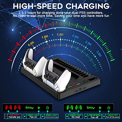 - ACCESORIOS DE CARGA/REFRIGERACIÓN PARA PS5: 3 ventiladores de refrigeración + estación de carga de doble controlador + interfaz USB + indicador LED de carga del controlador + soporte para auriculares. Está especialmente diseñado para la consola PlayStation 5 Disc Edition y Digital Edition, manteniendo las consolas de juego y los accesorios organizados
