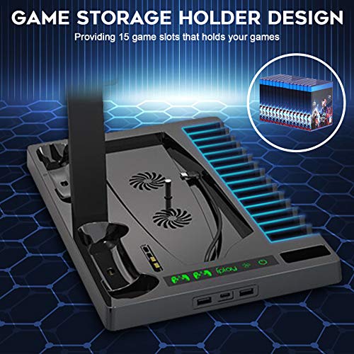 NEWZEROL Soporte compatible con para PS5, con ventilador de refrigeración y estación de carga para controlador PS5, soporte vertical para auriculares, con almacenamiento de 15 discos de juegos - Negro