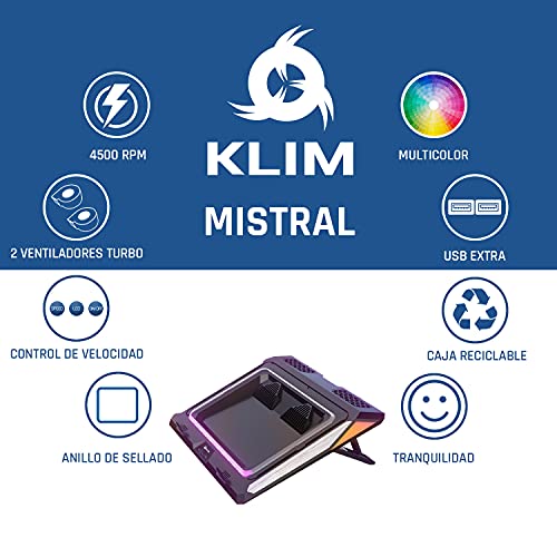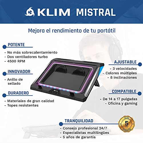 KLIM Mistral | Base de refrigeración para portátil | Potente Ventilador a 4500 RPM | Protege tu portátil Gaming y Aumenta su Rendimiento | Compatible de 14 a 17 Pulgadas | Nuevo 2022