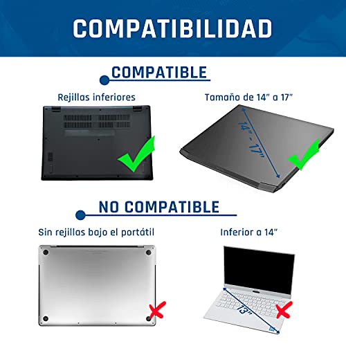 - ⚠️ INFORMACIÓN IMPORTANTE SOBRE COMPATIBILIDAD: KLIM Mistral es solo compatible con portátiles entre 14 y 17 pulgadas. No sirve para modelos más pequeños. Asegúrate de que tu portátil tiene orificios de ventilación por debajo para que el aire pueda salir a través de ellos. NO USES este modelo si tu portátil no tiene rejillas por debajo (por ejemplo, los modelos Apple MacBook). Para cualquier duda acerca de compatibilidad, escríbenos utilizando la opción «Contactar con el vendedor».