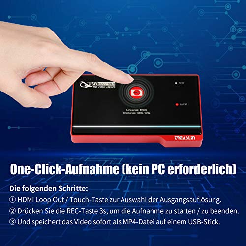 - Grabación con un solo clic: fácil de trabajar sin ningún ajuste, guarda videos en un dispositivo USB. Grabación con un solo clic, una pulsación corta cambia entre la captura de 720p y 1080p, y una pulsación larga inicia y detiene la grabación (sentido de vibración). Durante la grabación hay iluminación LED como una confirmación visual.