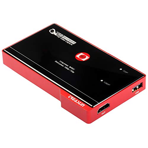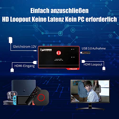 - Dispositivo de grabadora HDMI a USB de 1080p: la grabadora de pantalla HDMI puede grabar una consola de juegos, caja de TV, cámara web, VCR, PC, reproductores de DVD, DVR, reproductor Blu-Player en 1080P y guardar los archivos MP4 en una unidad flash USB. Esta tarjeta de captura no es compatible con la transmisión en vivo, no requiere un PC para funcionar.
